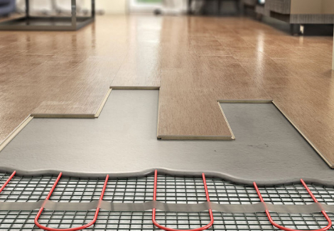 Уложили MSPC — новый материал на рынке. Каменный ламинат, так сказать, уложен ёлочкой. Много конвекторов. Примыкания к конвекторам обыграются планкой.